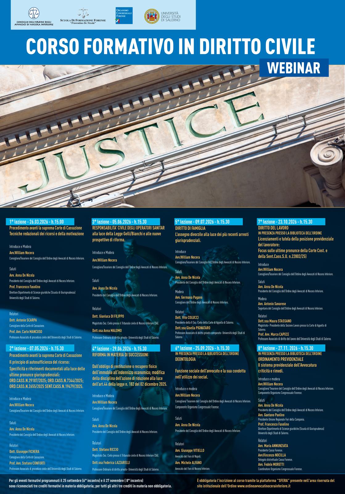 26/03 – 07/05- 05/06 – 29/06 – 09/07 – 25/09 – 23/10 – 27/11/2026 – CORSO FORMATIVO IN DIRITTO CIVILE – Modalità WEBINAR (con n. 3 eventi in presenza presso la Biblioteca dell’Ordine) – riconosciuti tre crediti formativi per ogni singolo evento (n. 2 eventi in materia obbligatoria) – Consiglio dell'Ordine degli Avvocati Nocera Inferiore
