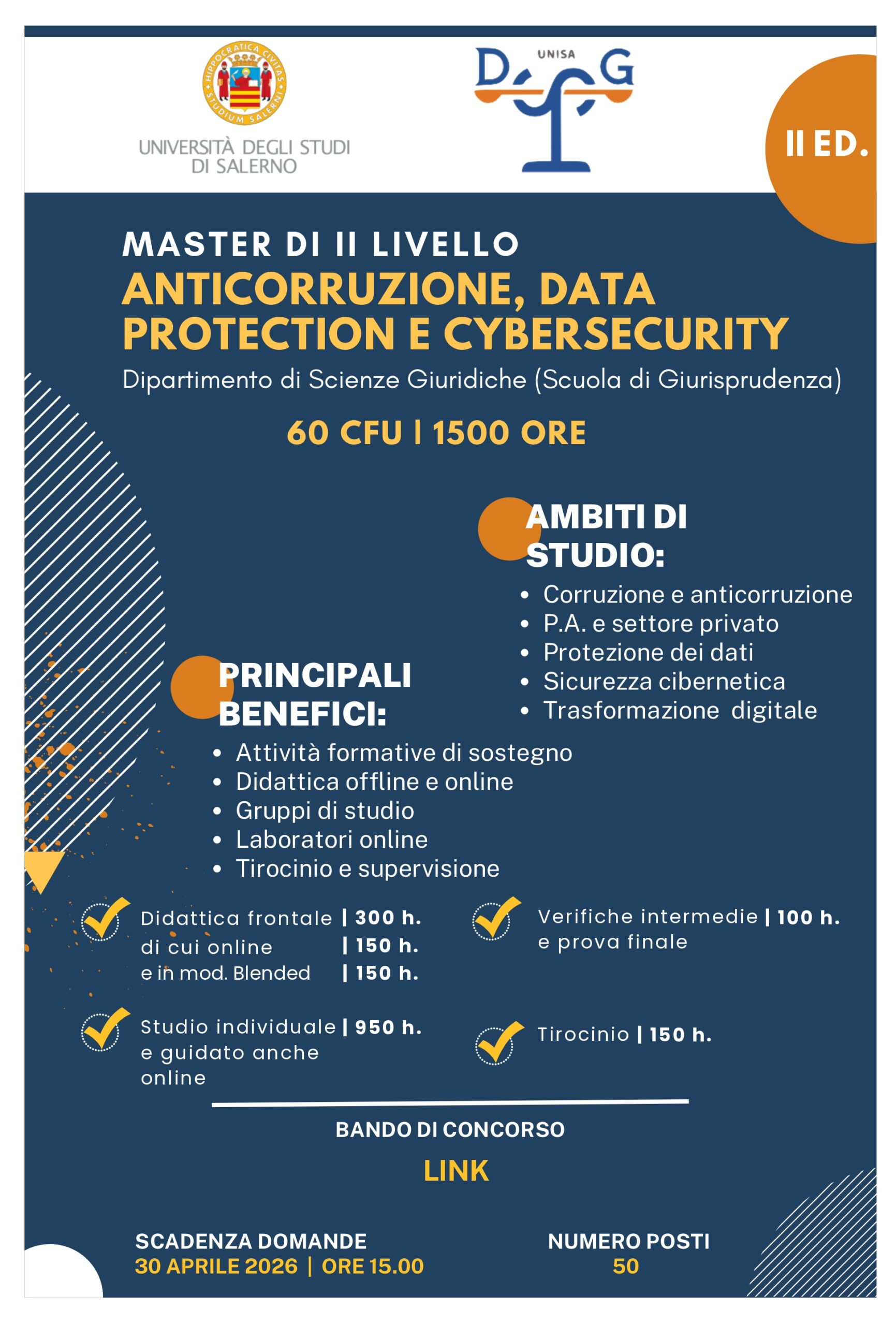 Il Dipartimento di Scienze Giuridiche dell’Università degli Studi di Salerno ha indetto la seconda edizione del Master di II Livello in “Anticorruzione, Data Protection e Cybersecurity”