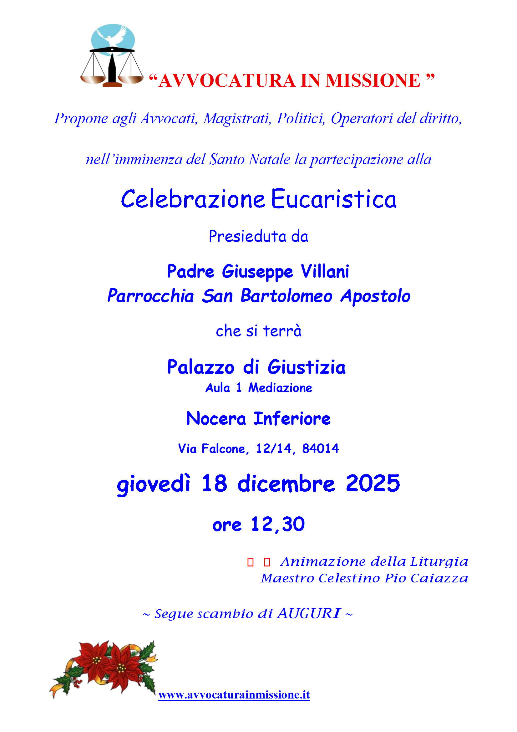 Il Consiglio dell’Ordine degli Avvocati di Nocera Inferiore, in collaborazione con l’Associazione “Avvocatura in missione”, ha il piacere di invitare gli iscritti alla Celebrazione Eucaristica organizzata in occasione del Santo Natale.