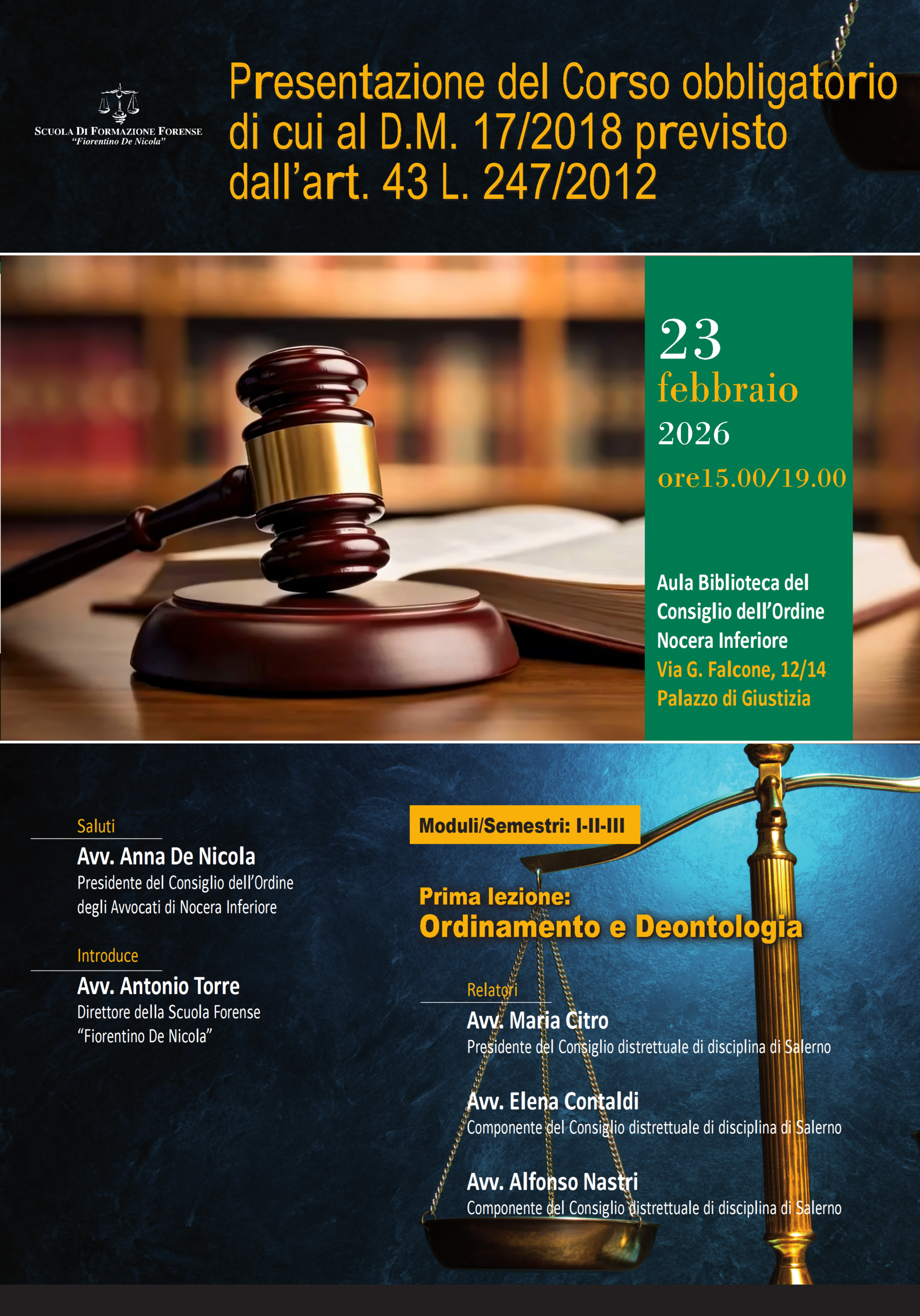 Corso di formazione obbligatorio di cui al D.M. 17/2018 previsto dall’art. 43 Legge 247/2012 – Consiglio dell'Ordine degli Avvocati Nocera Inferiore